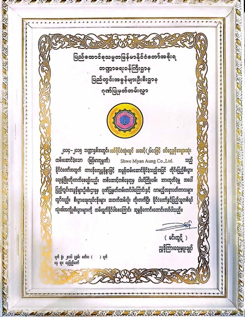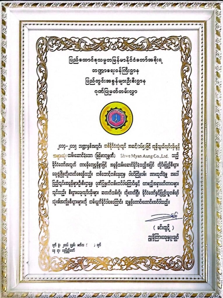 Shwe Myan Aung is proud to have been ranked #260 among the top income tax payers and #165 among the top commercial tax payers for the financial year of 2014-2015. We remain committed to financial transparency and national development by consistently fulfilling our tax obligations. Our steady progress in these rankings reflects our continued growth, and we aim to improve further in the years ahead.